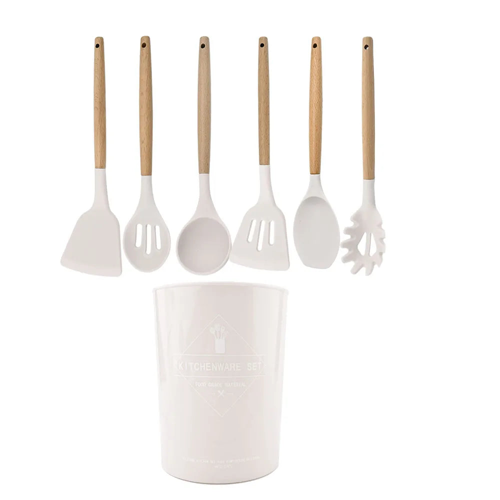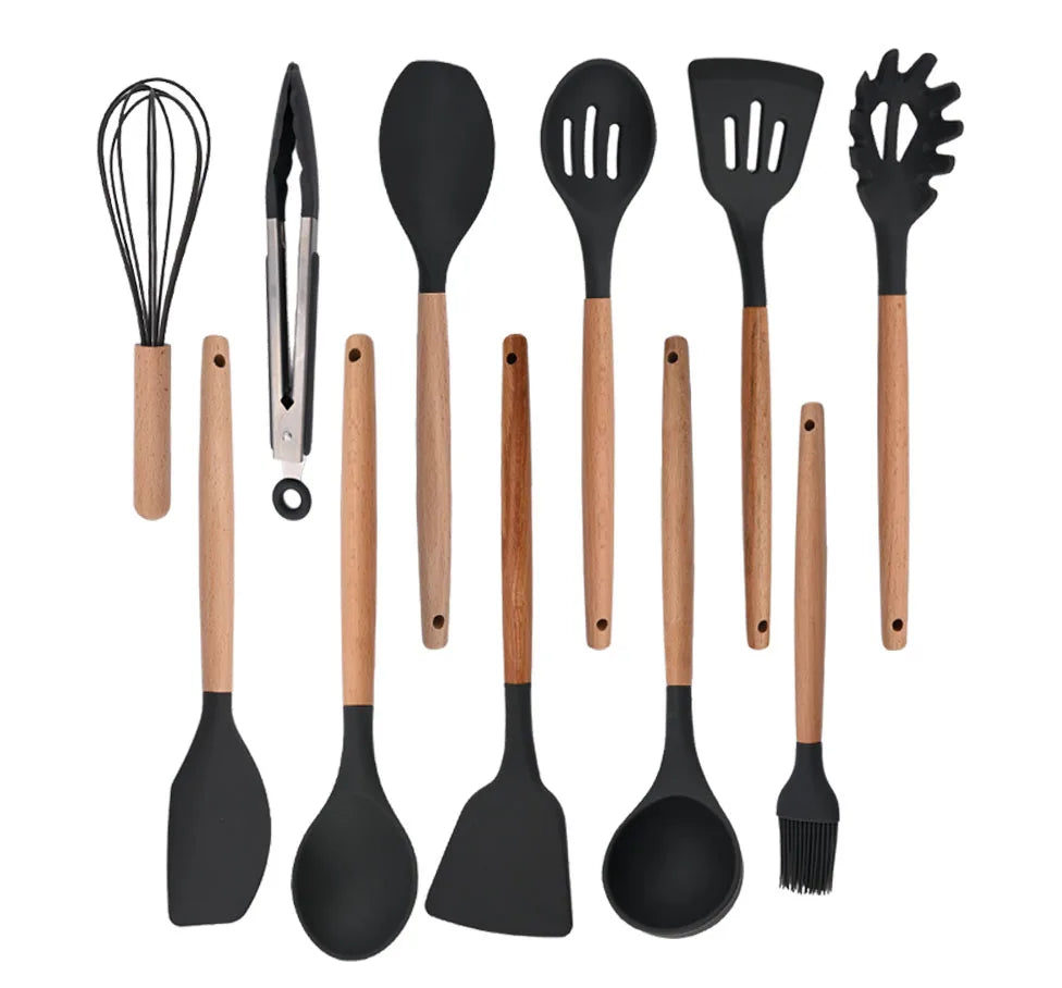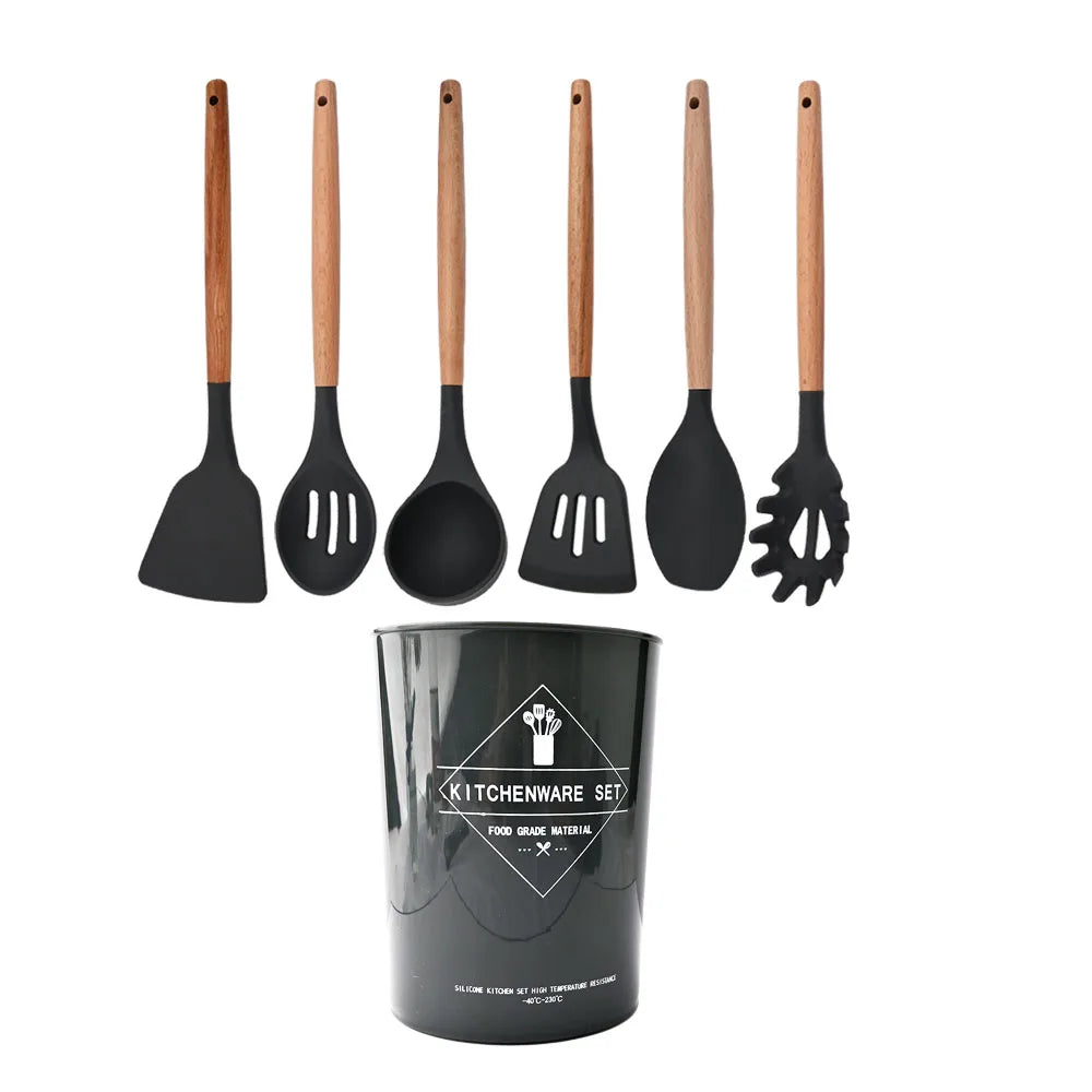 Silicone Kitchenware Cooking Utensils Set Non-stick Cookware Spatula Shovel Egg Beaters Wooden Handle Kitchen Cooking Tool Set