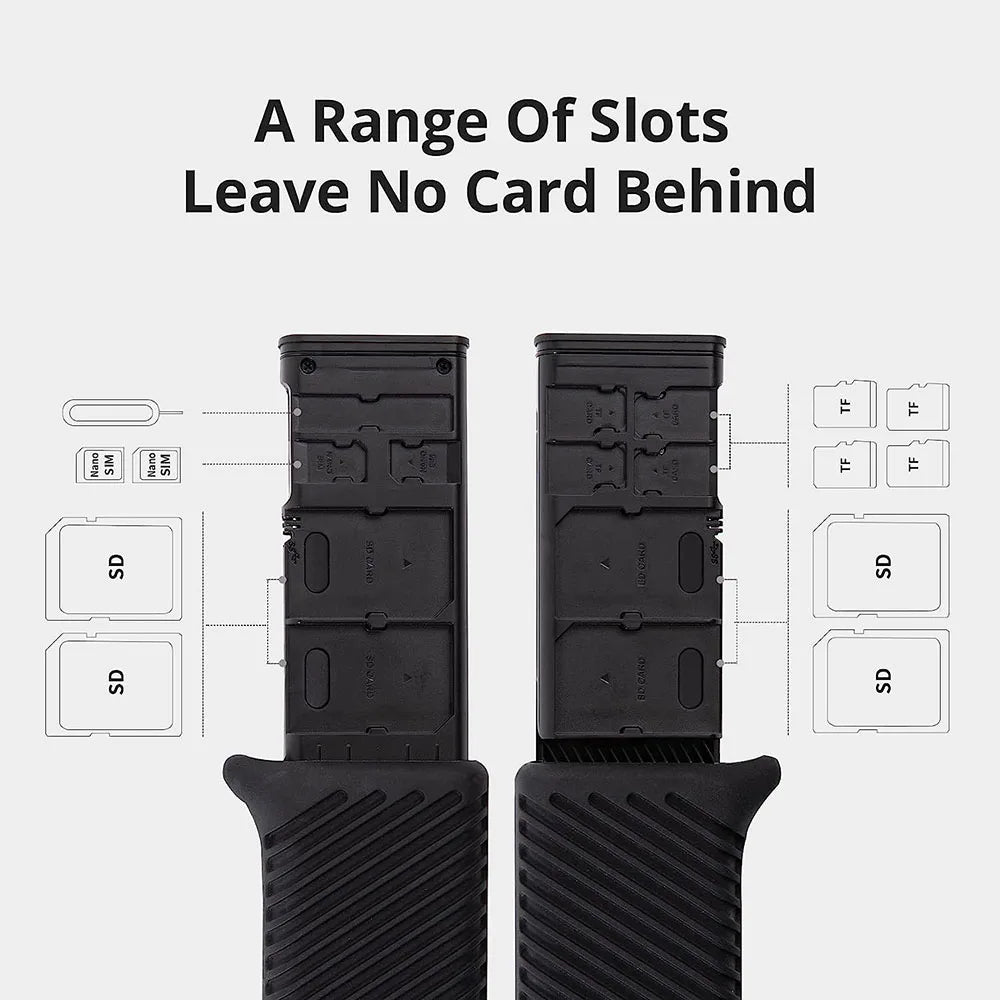 This multi-functional memory card storage case integrates memory card storage and ultra-high-speed data reading functions, which can meet the storage and data transmission needs of photographers' memory cards during daily, work and travel. As a card case, it can accommodate two Nano SIM cards, four SD cards, four TF cards, and an eject pin. As a card reader, SD and TF dual card slots support data transfer at the same time.