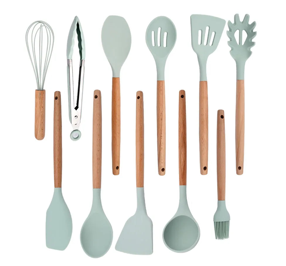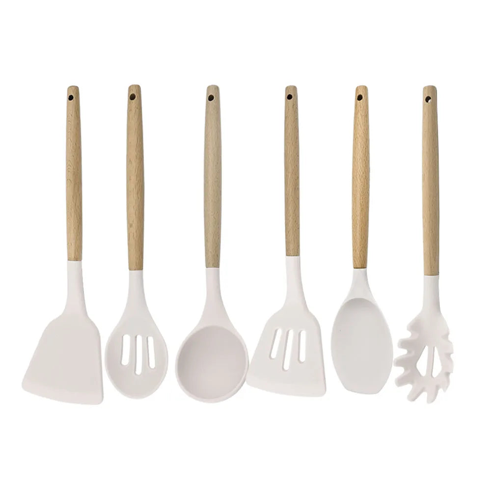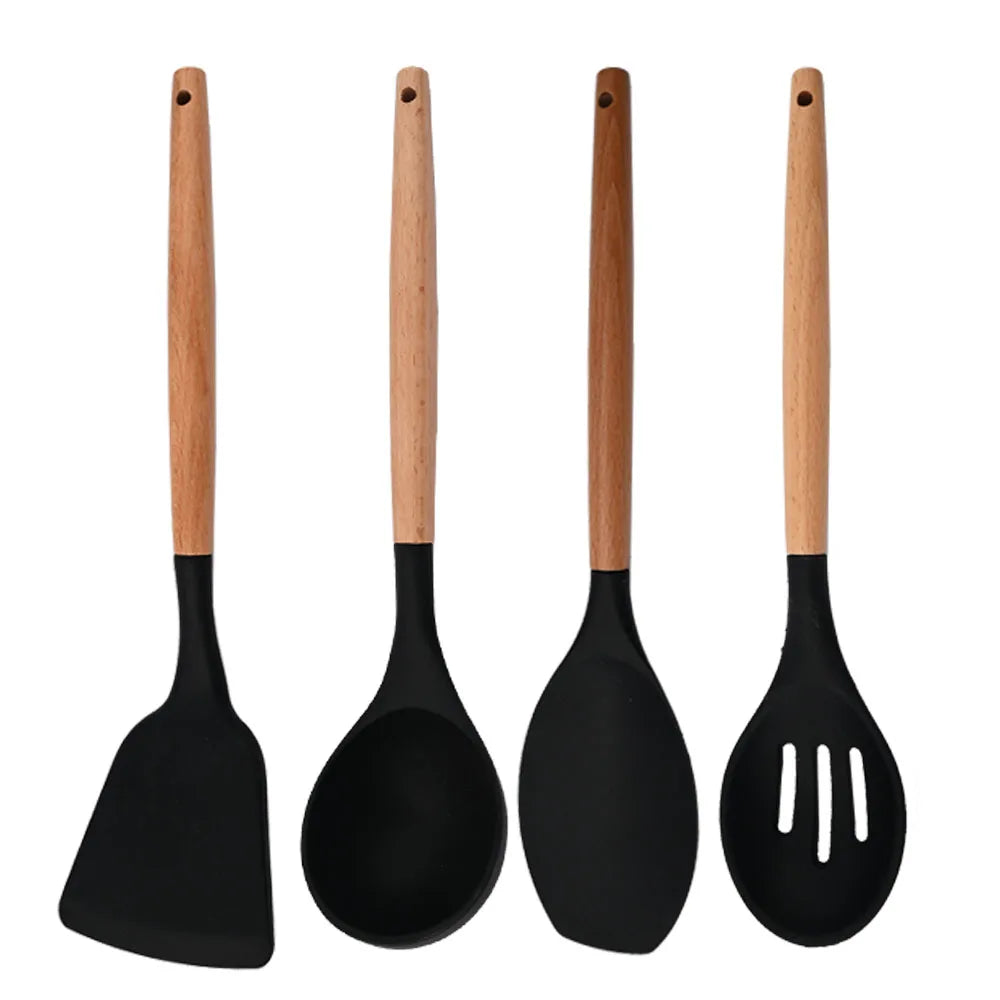 Silicone Kitchenware Cooking Utensils Set Non-stick Cookware Spatula Shovel Egg Beaters Wooden Handle Kitchen Cooking Tool Set