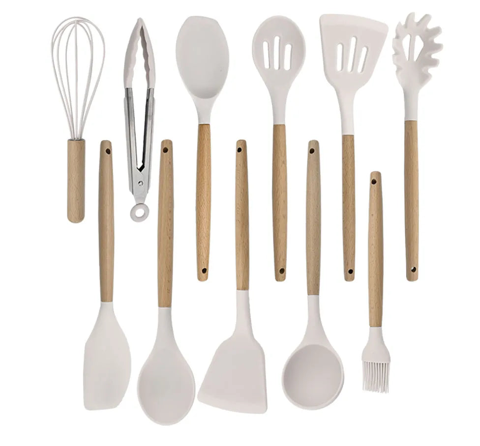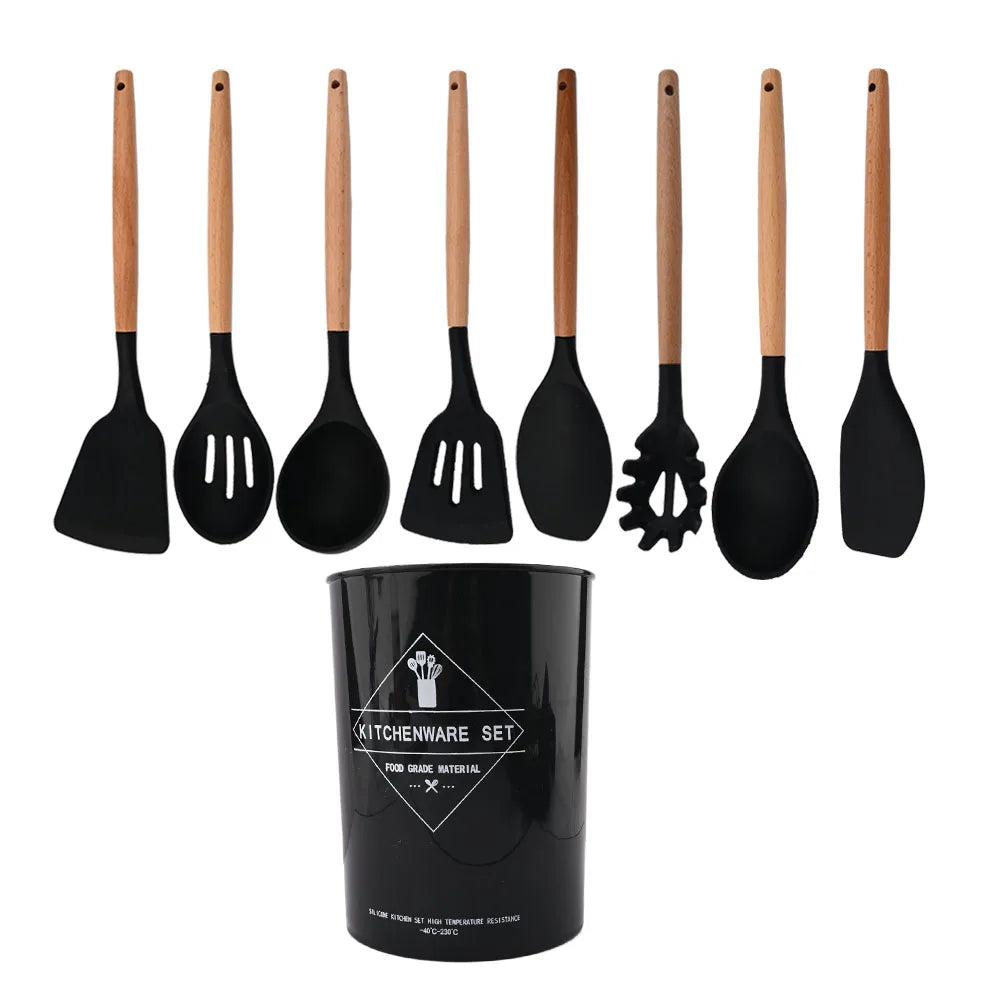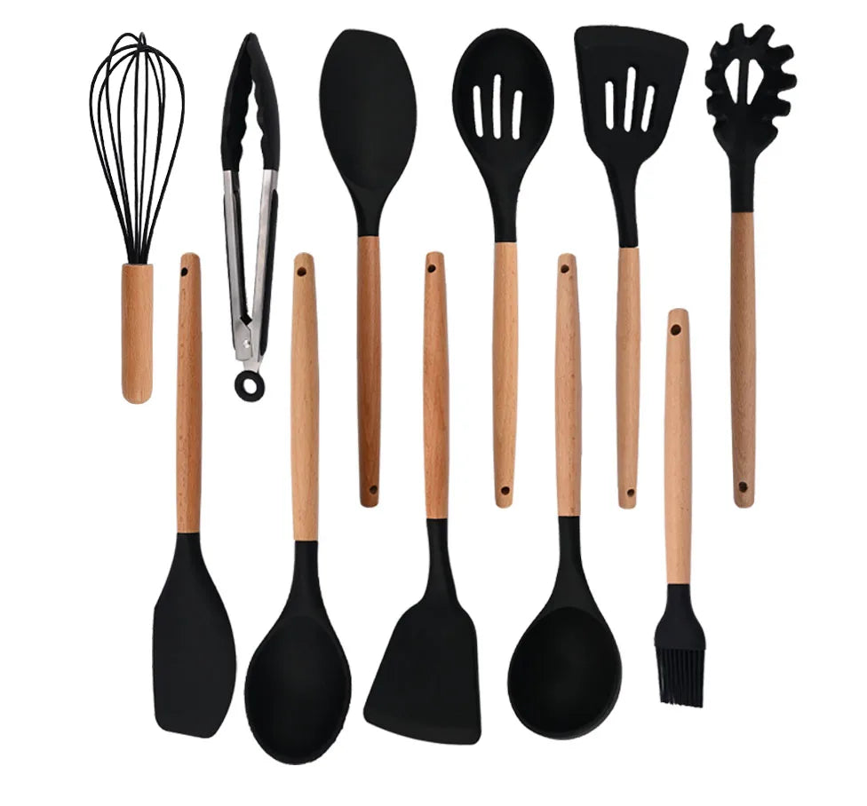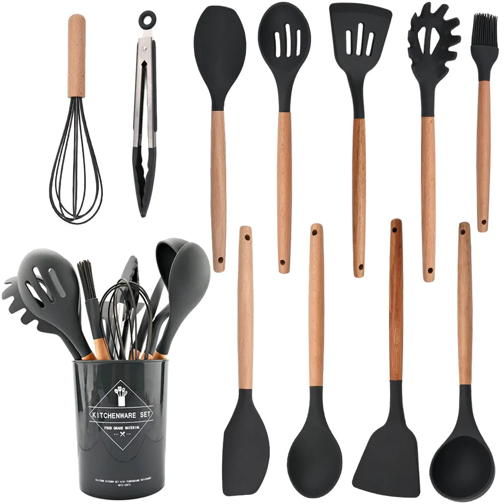 Silicone Kitchenware Cooking Utensils Set Non-stick Cookware Spatula Shovel Egg Beaters Wooden Handle Kitchen Cooking Tool Set